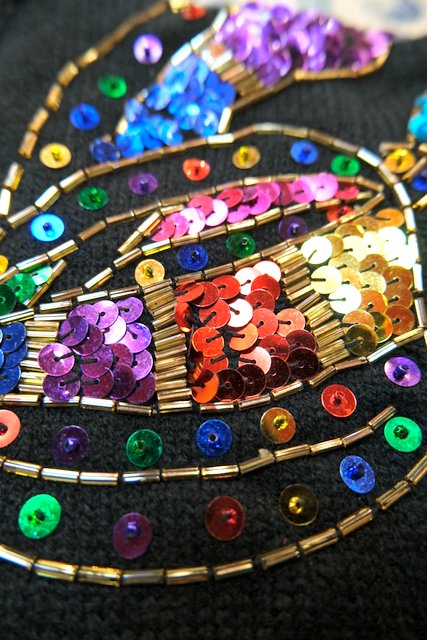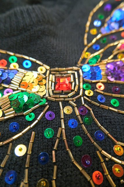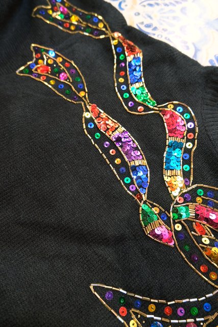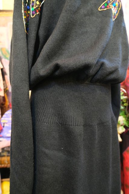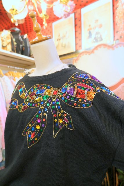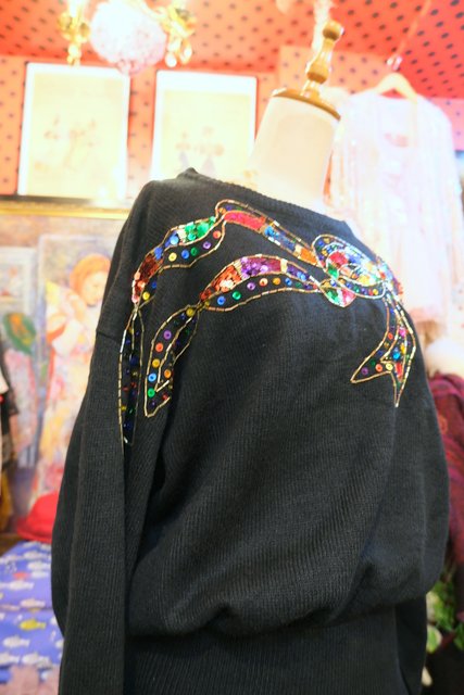 ウエストリブデザインのオーバーサイズにカラフルスパンコール×ビーズのリボン装飾が魅力的な1980年代頃のヨーロピアンニットワンピース