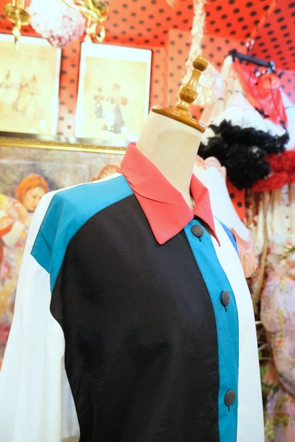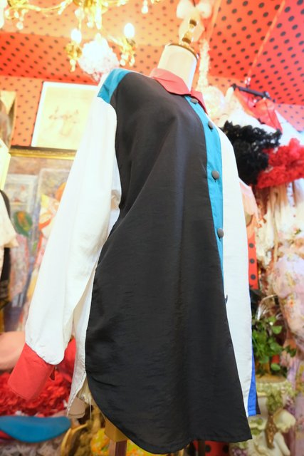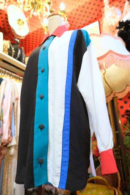 赤、黒、白、ブルー、グリーンのカラフルポップな切り替えデザインが魅力的な1980年代頃のヨーロピアンオーバーサイズシャツ