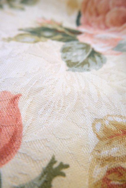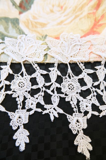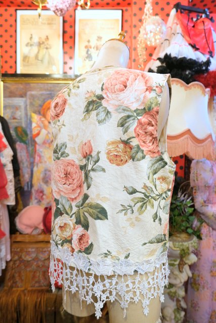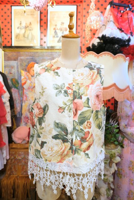 模様入りの生地にエレガントな花柄プリント×裾の薔薇レースフリンジデザインがお洒落な1980年代頃のヨーロピアンガーリーベスト