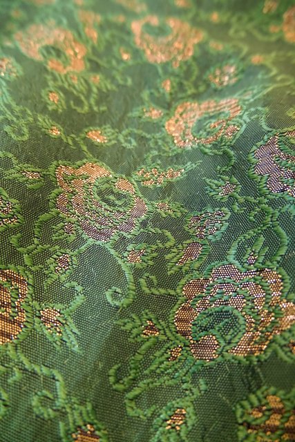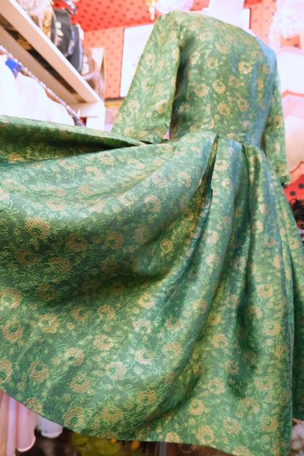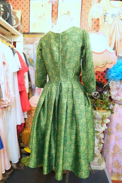 エレガントな光沢感があるスピナッチグリーン色に華やかなゴールドお花模様やふんわり広がるタック入りスカートが魅力的な1950年代頃のヨーロピアンヴィンテージワンピース