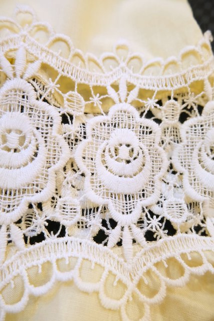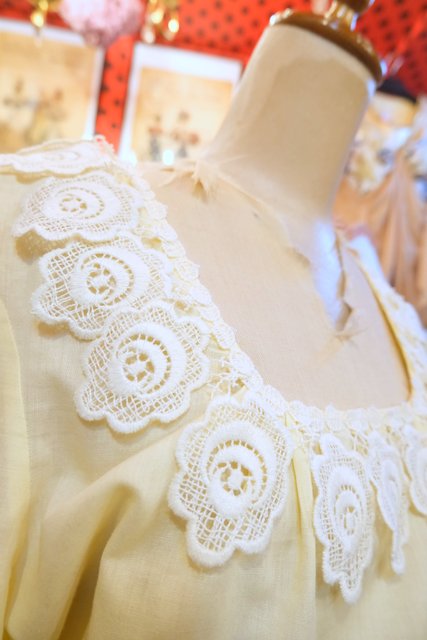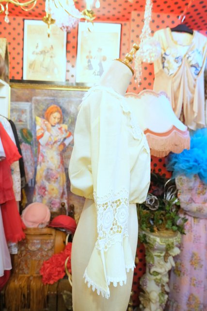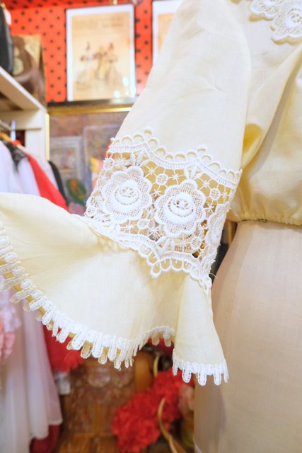 首周りのロマンティックな花柄レースに透け感があるレース袖やドレープ感があるフレアカフスが魅力的な1970年代頃のヨーロピアンヴィンテージチロルブラウス