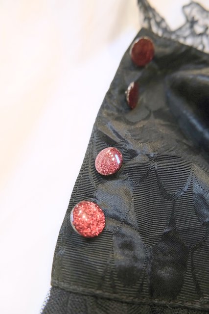 光沢感があるレトロ模様の生地に繊細な黒レースフリル襟やエレガントなラバティンカラーレース、ラメ混じりのボタンがお洒落でカッコいい1970~80年代頃のヨーロピアンヴィンテージゴシックブラウス