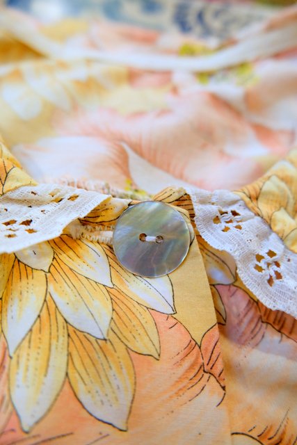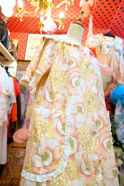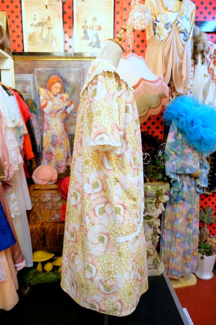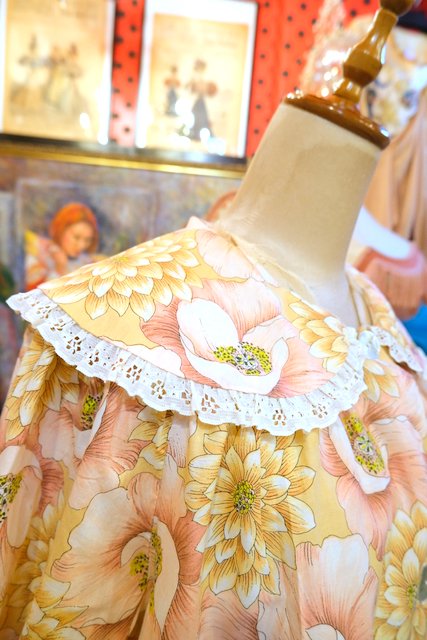ピンク×ベージュのレトロガーリーな花柄プリントにフリルレース付きの丸襟デザインが可愛らしいヨーロピアンシャツワンピース エレガンスな輝きのシェルボタンがお洒落ポイント!