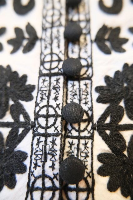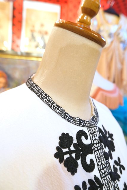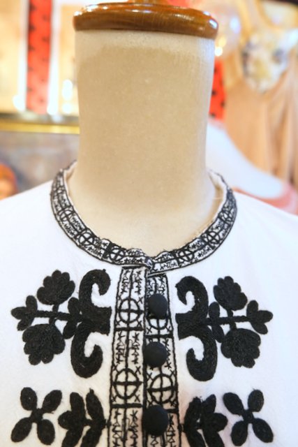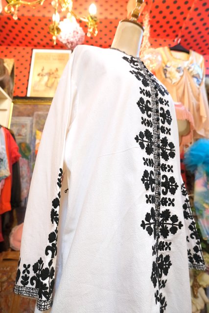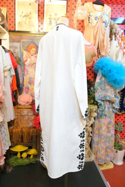 白ベースに首回り、前立て部分の細かい刺繍やレトロ感たっぷりの花柄刺繍、後ろ着丈の方が長い個性的なデザインが魅力的なヨーロピアンエスニックワンピース 羽織でもお洒落なアイテム!★SALE★