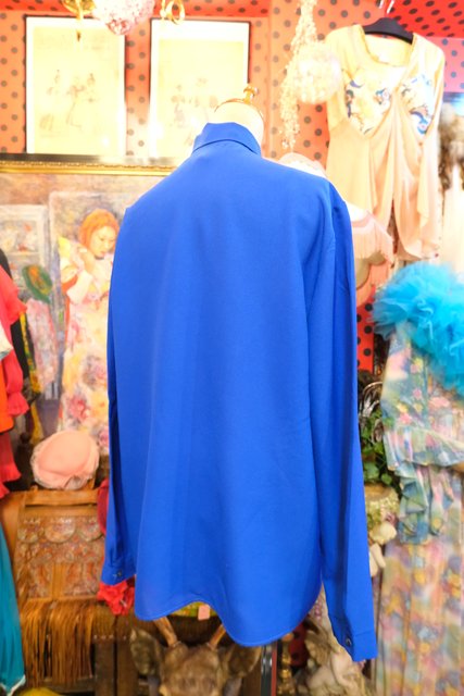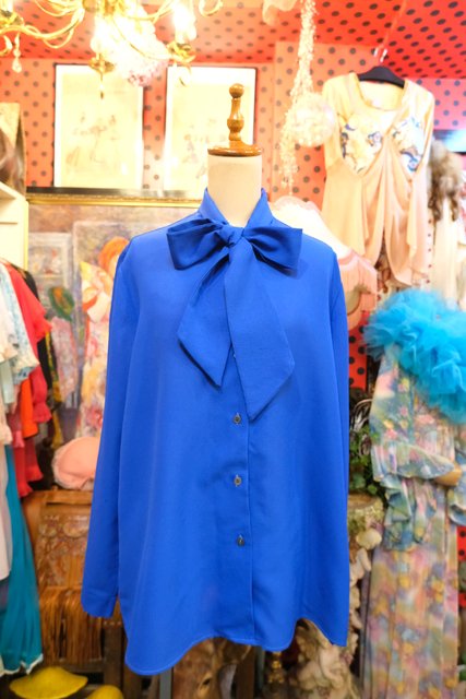 エレガントにもマニッシュな印象にもなるリボンボウタイデザインにクールな印象のブルーカラーが魅力的な1970~80年代頃のヨーロピアンブラウス