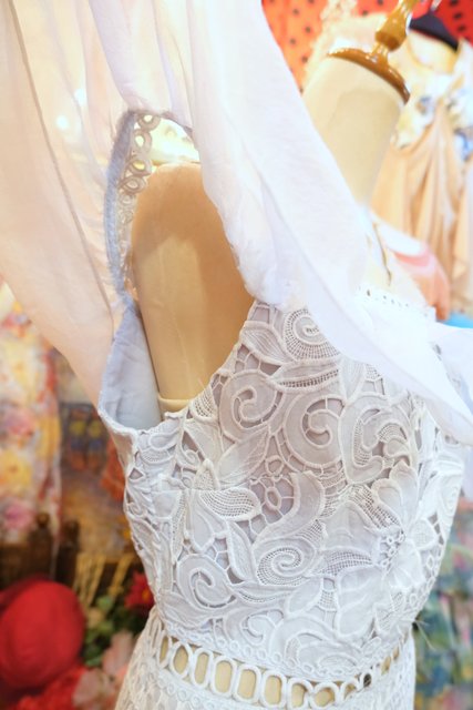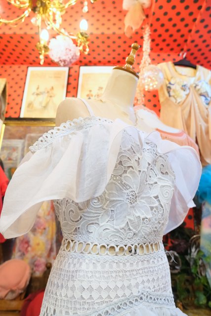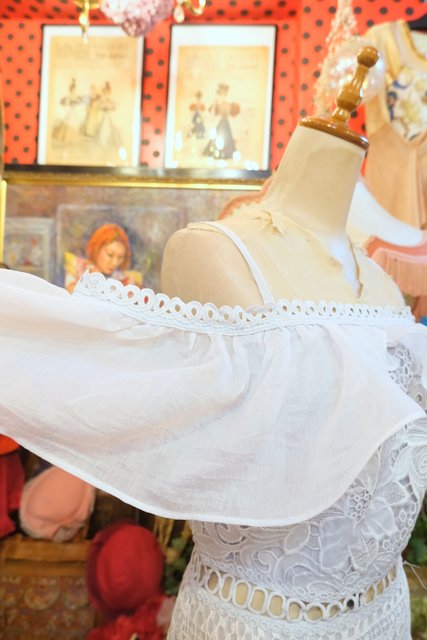 ネックラインが大きく開いたオフショルダー×華やかな花柄レースデザインにボリューミーなチュールフリルが魅力的なヨーロピアンパーティードレス ウエストの透け感があるレースがお洒落ポイント!