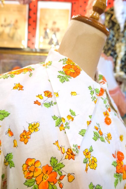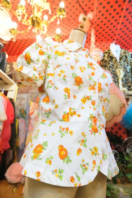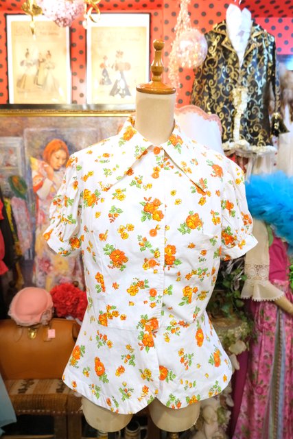 レトロガーリーな花柄プリントにパフスリーブやペプラムデザインが可愛らしい1970年代頃のヨーロピアン半袖ブラウスジャケット