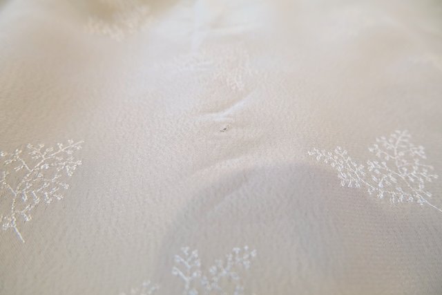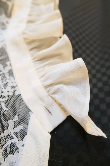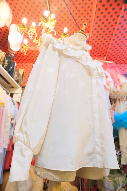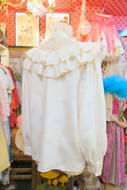 リーフ模様の光沢感がある生地にボリューミーなフリルデザイン×エレガントな花柄レースの透け感、レトロ感たっぷりのちょうちん袖が魅力的な1970年代頃のヨーロピアンヴィンテージブラウス