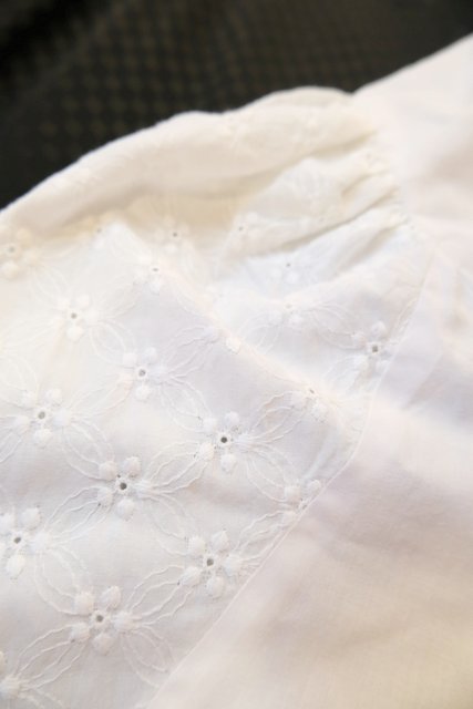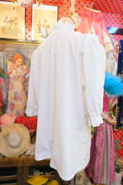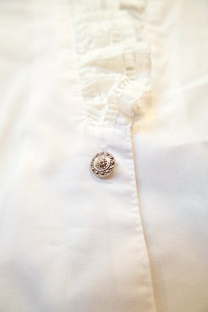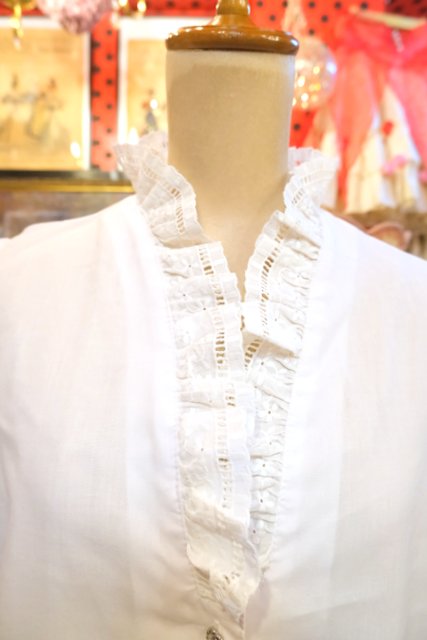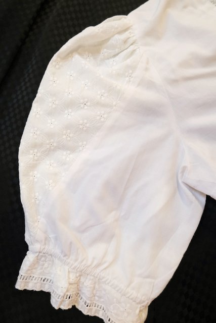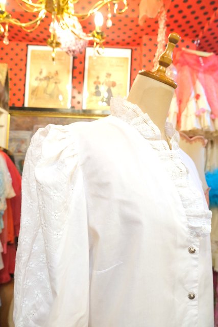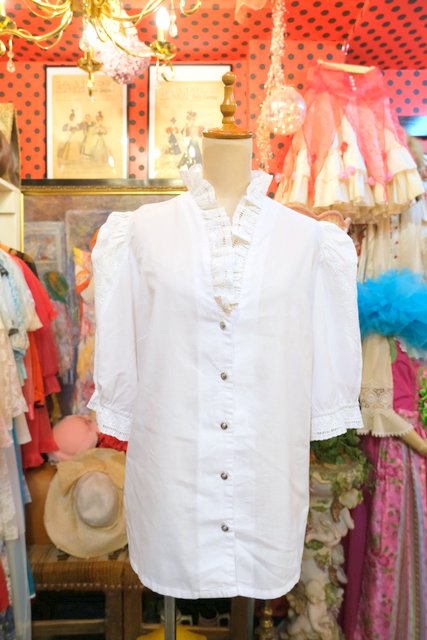 お花刺繍入りのボリューミーなパフスリーブデザインやフリル襟、レトロなシルバーボタンが魅力的な1980年代頃のヨーロピアンチロルブラウス ★SALE★