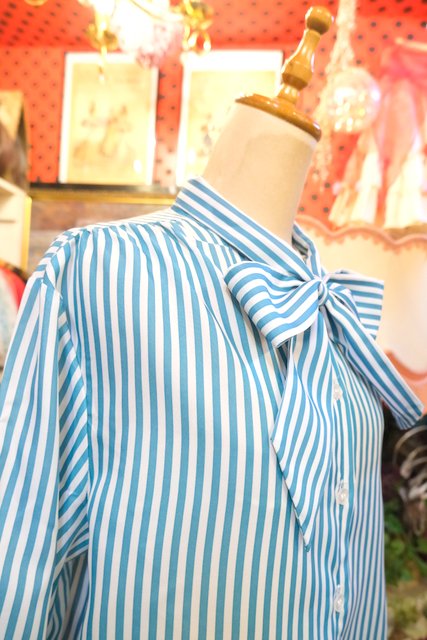 ヨーロッパ古着レトロストライプリボンボウタイブラウス