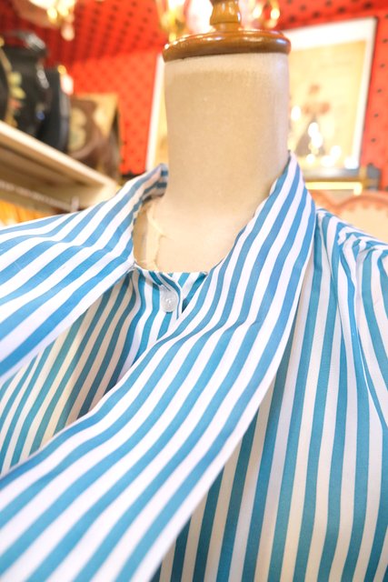 エレガントにもマニッシュな印象にもなるリボンボウタイデザインが魅力的な1970~80年代頃のヨーロピアンストライプブラウス