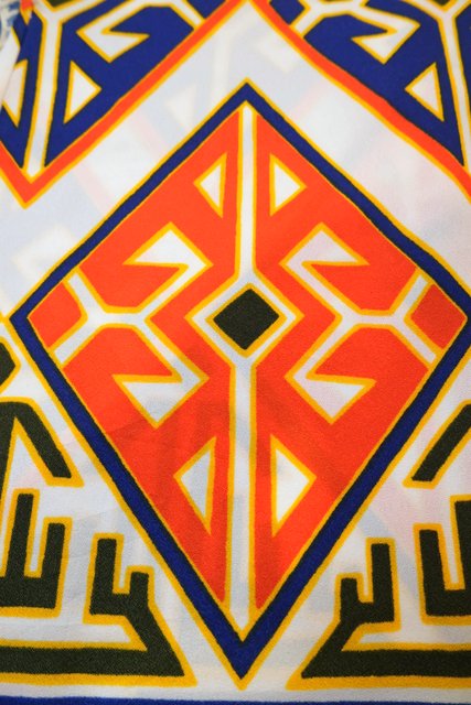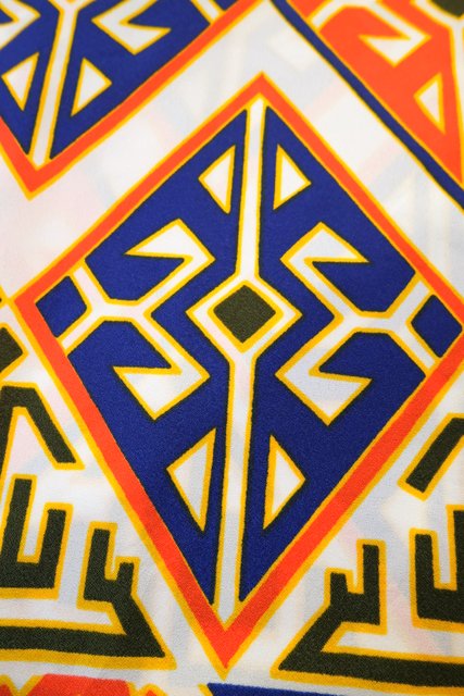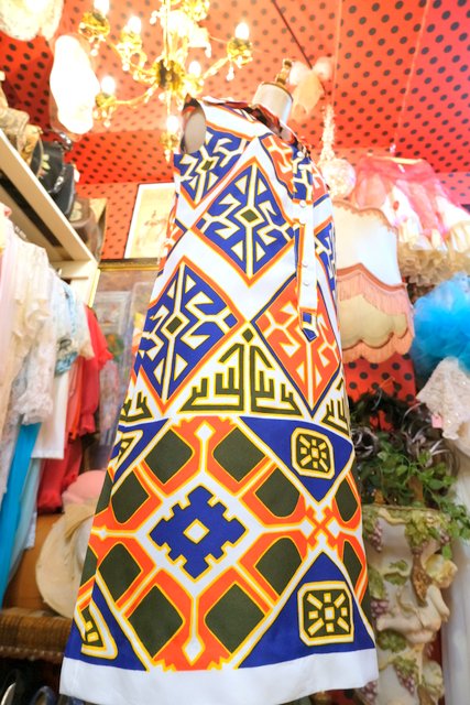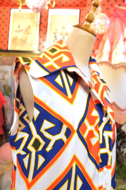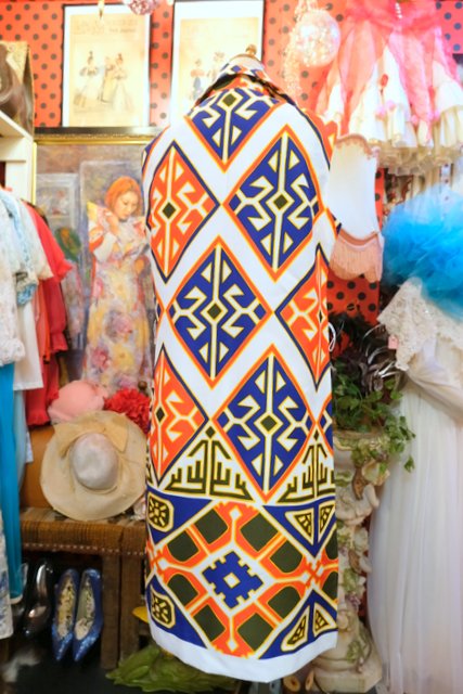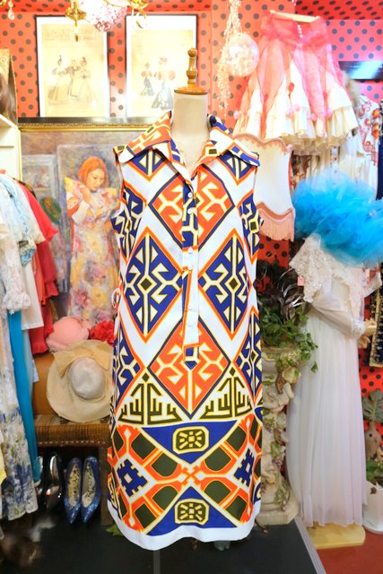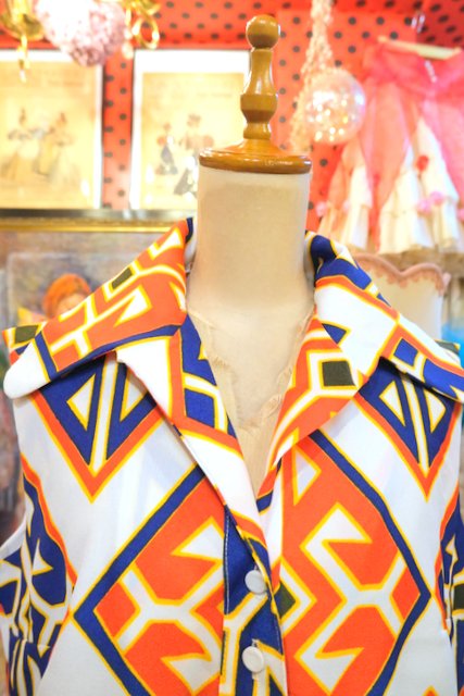 目を惹くカラフルな幾何学模様に先が丸くなった襟がレトロ感たっぷりの1970~80年代USA製LANVINヴィンテージワンピース