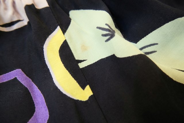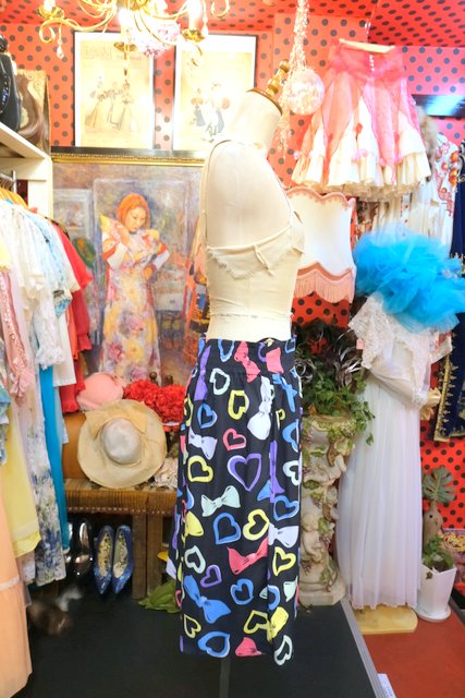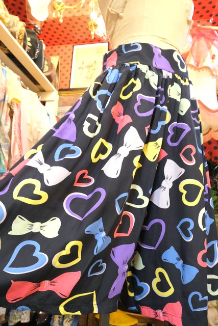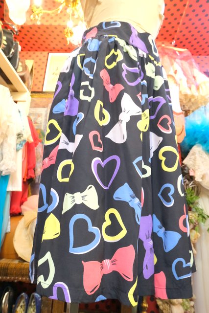 黒ベースにカラフルポップなリボンやハートプリントが可愛らしい1980年代頃のヨーロピアンフレアパンツ