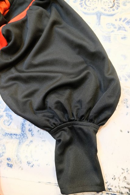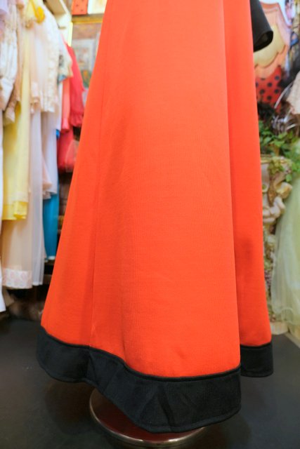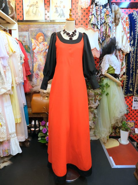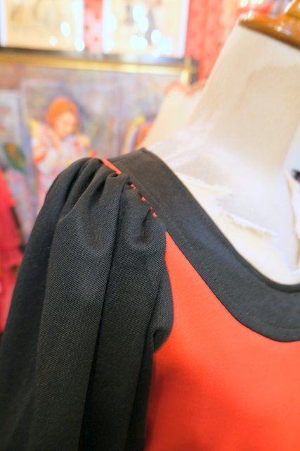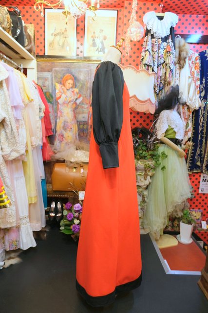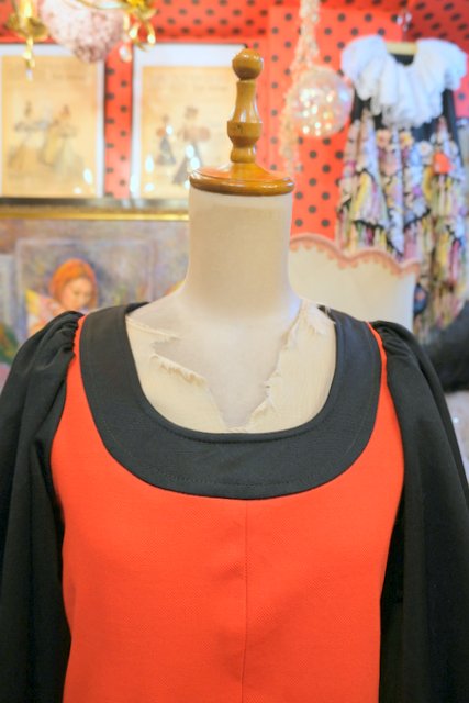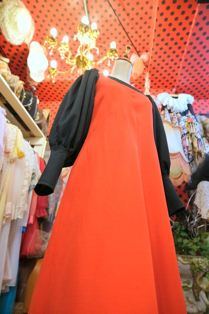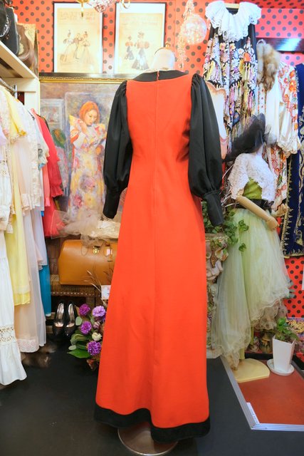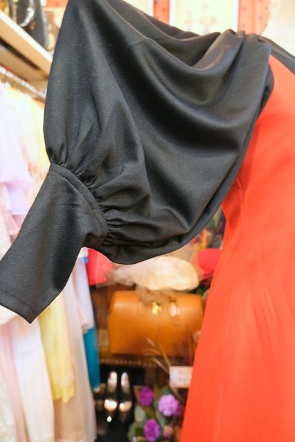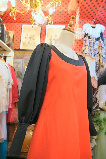 モダンな赤黒切り替えデザインにボリュームパフスリーブ×袖の膨らみを強調してくれるロングカフスが魅力的な1970年代頃のヨーロピアンヴィンテージワンピース