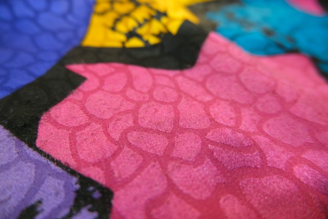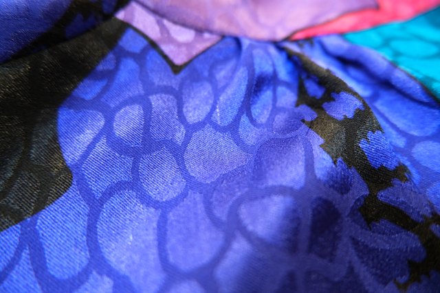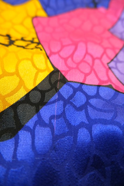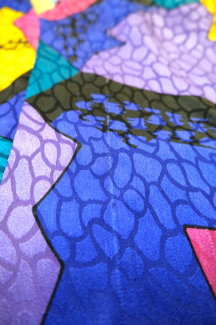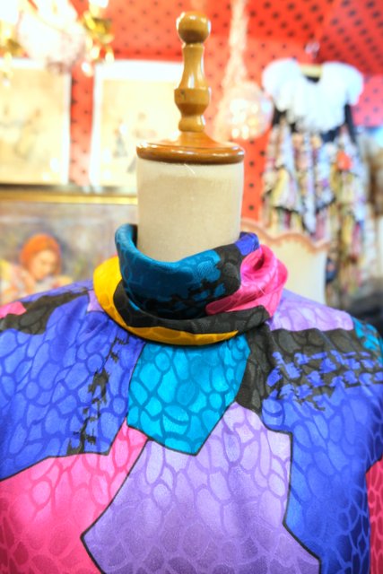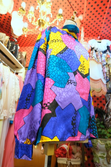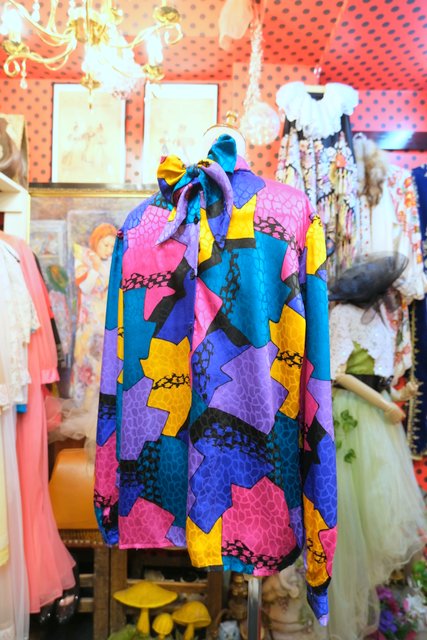 光沢があるアニマル風な生地にカラフルポップなパッチワーク柄×バックリボンがお洒落な1980年代頃のヨーロピアンブラウス