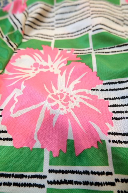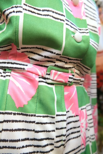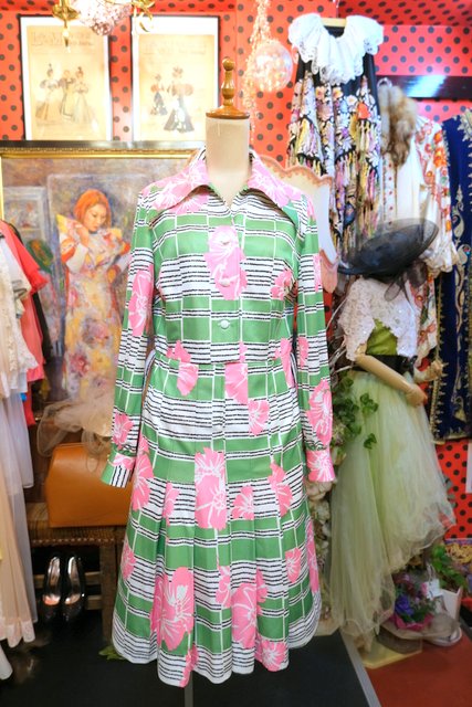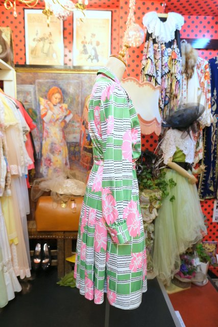 カラフルポップな黄緑×ピンク花柄プリントにベルト付きが可愛らしい1970年代頃のフランス製ヴィンテージワンピース