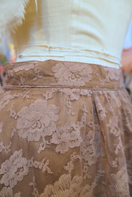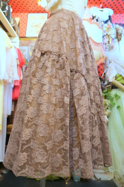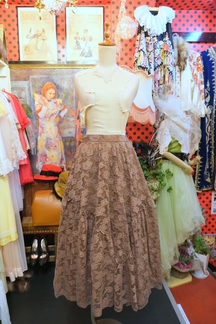 カントリーな茶系の花柄レース×フレアデザインが可愛らしい1980年代頃のヨーロピアンヴィンテージスカート