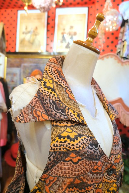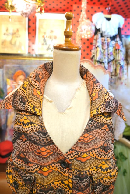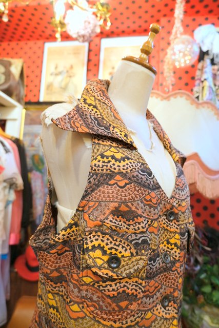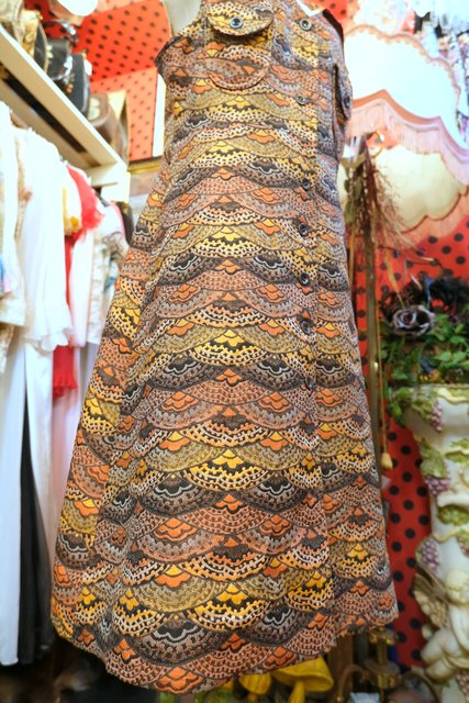 扇のようなレトロ模様に首周りが大きく開いたデザインやポケットが可愛らしい1960~70年代頃のヨーロピアンヴィンテージワンピース