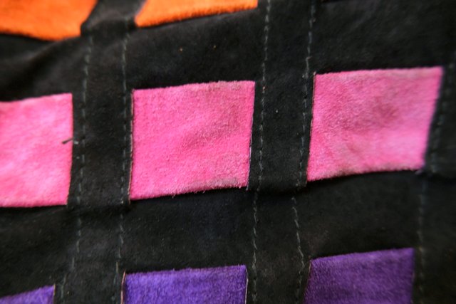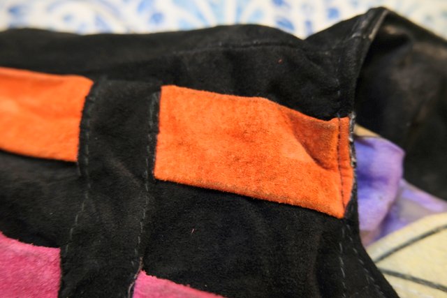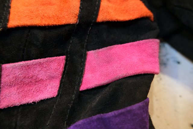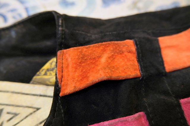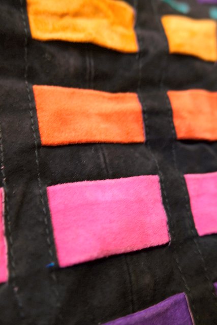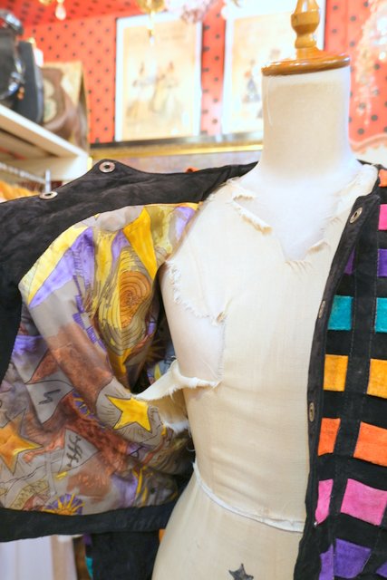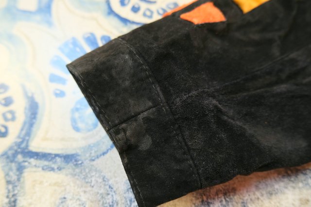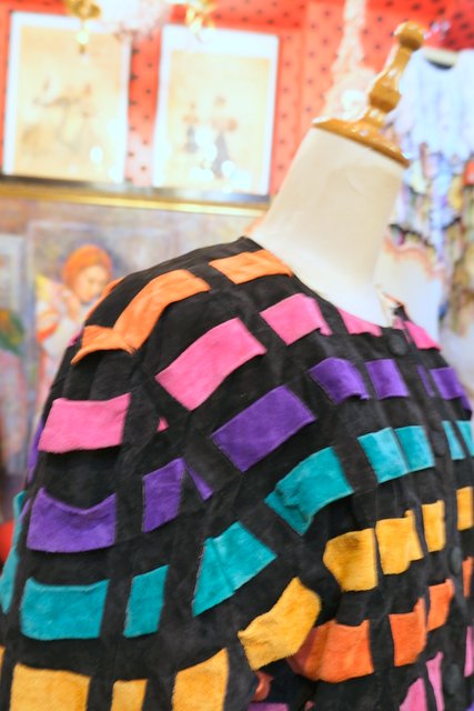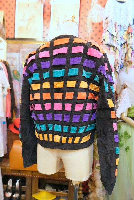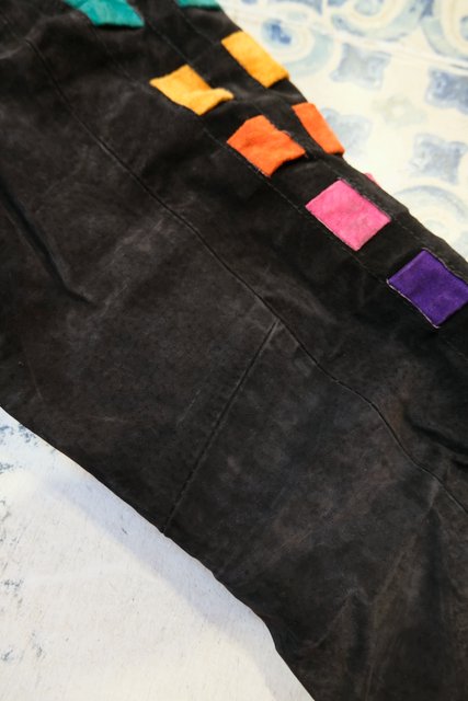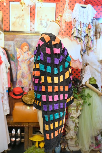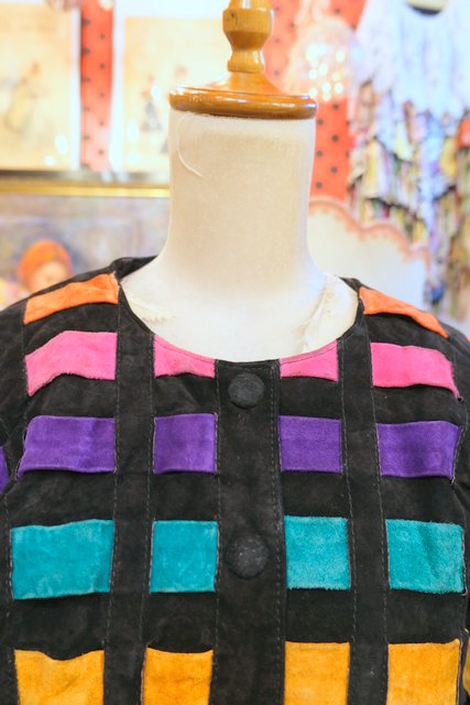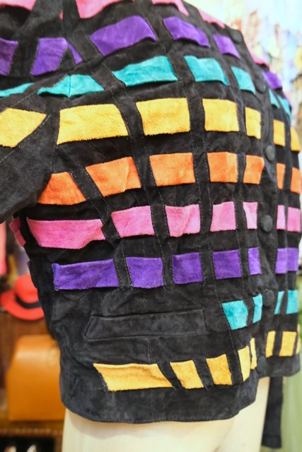黒スエードレザーにカラフルポップなパッチワークデザインや総柄裏地がお洒落で個性的な1980年代頃のヨーロピアンヴィンテージレザージャケット