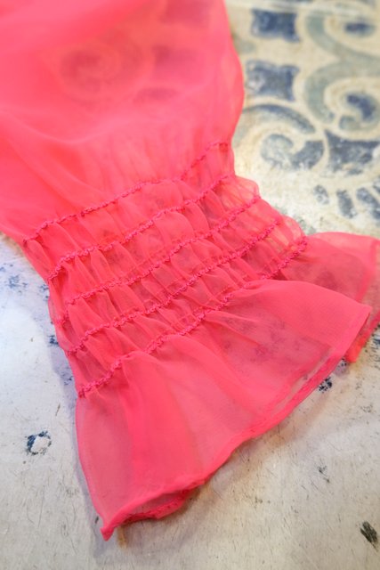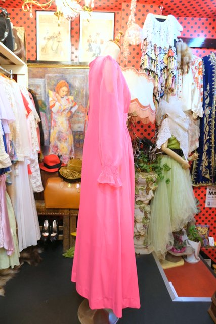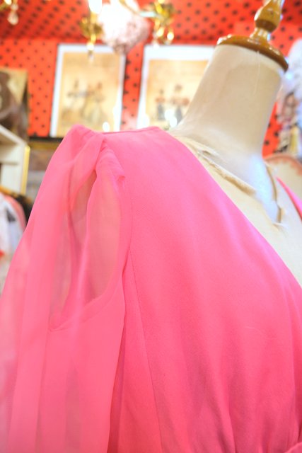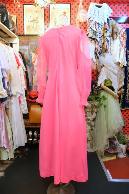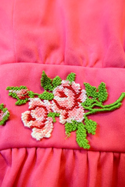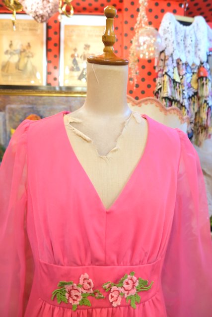 セクシーな透け感のシフォン袖にクロスステッチ刺繍のお花デザインが可愛らしい1970年代頃のヨーロピアンヴィンテージワンピース