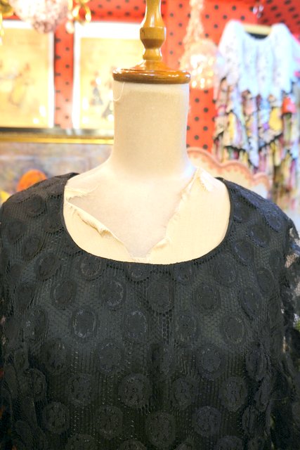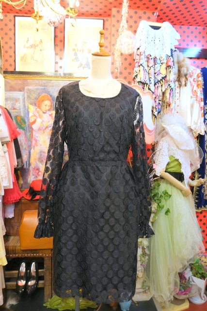 お花模様入りのドット柄に袖の透け感やタイトデザインがお洒落でカッコいい1970~80年代頃のヨーロピアンヴィンテージワンピース パーティーや2次会におススメ!