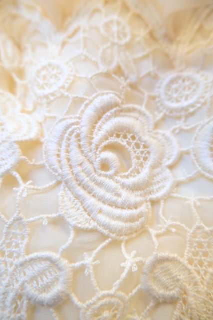 繊細で華やかな花柄レース×シフォンフリルデザインに透け感があるボリューミーなバルーンスリーブが魅力的な1970年代頃のヨーロピアンヴィンテージドレス