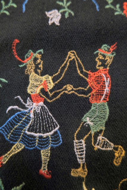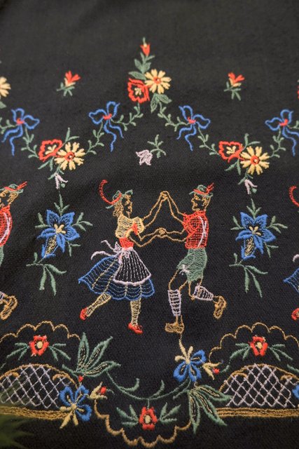 カラフルポップな花柄やディアンドル衣装を着て踊っている男女の刺繍デザインがお洒落で可愛い1960年代頃のヨーロピアンヴィンテージスカート