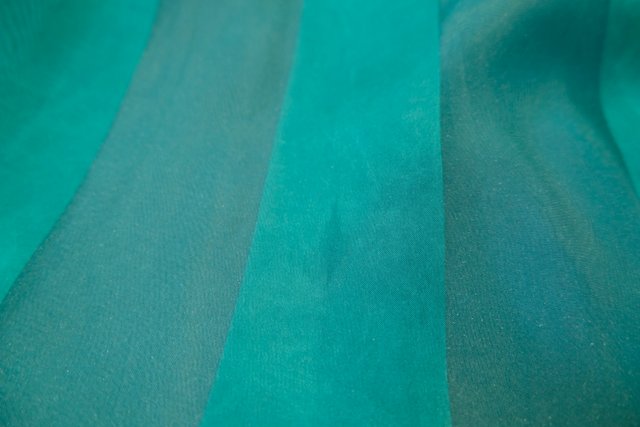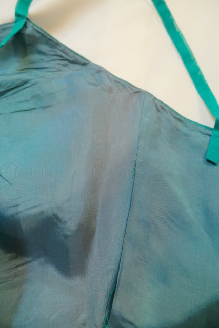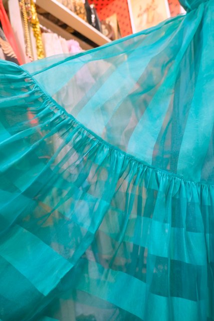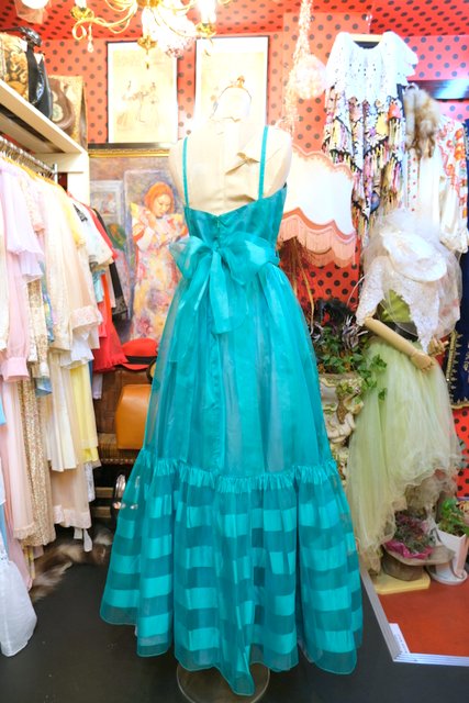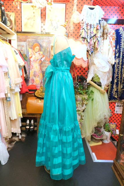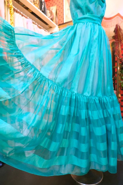 エレガントな透け感があるグリーンストライプシフォンにリボンやウエストの腰ひもリボンが可愛らしい1970年代頃の旧西ドイツ製ヴィンテージパーティードレス