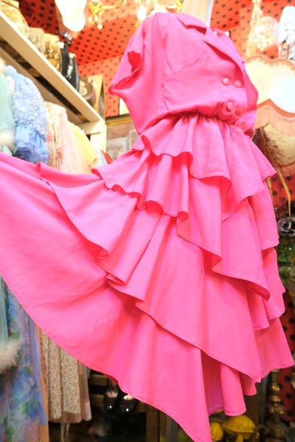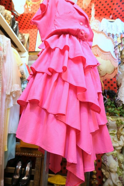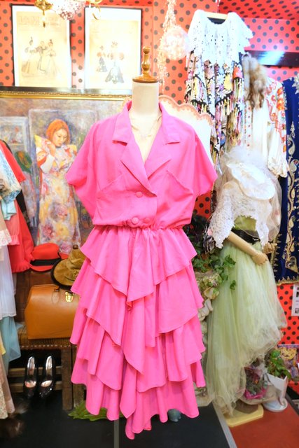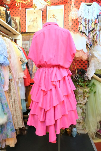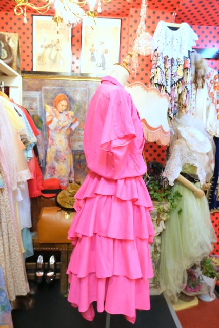 エレガントなドルマンスリーブ×ボリューミーなフリルティアードスカートが魅力的な1980年代頃のヨーロピアンヴィンテージワンピース