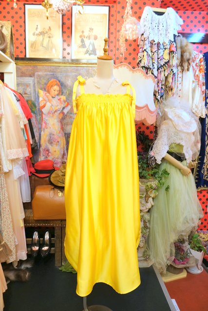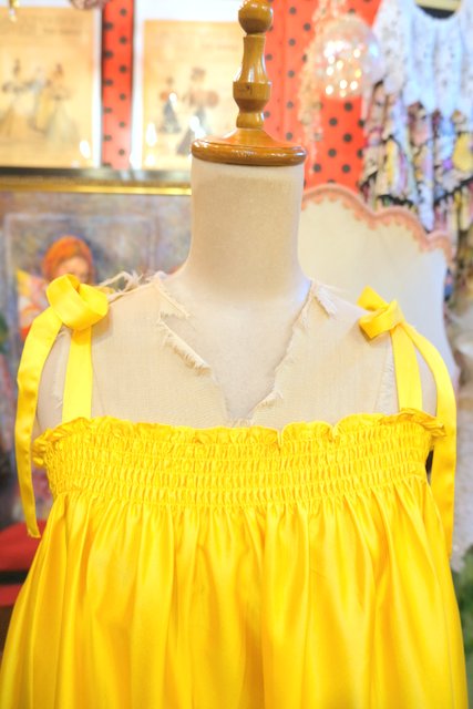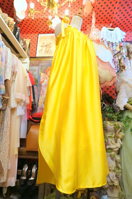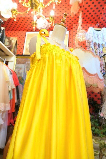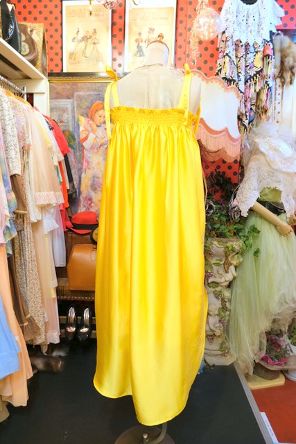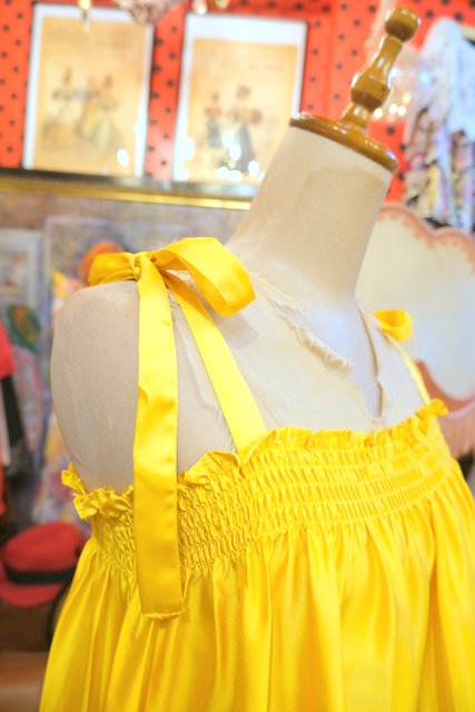 光沢がある色鮮やかなイエローに肩紐リボンや両サイドスリット入りの丸みがあるシルエットが可愛らしいヨーロピアンキャミワンピース