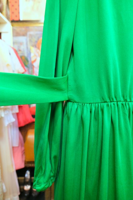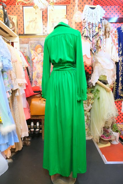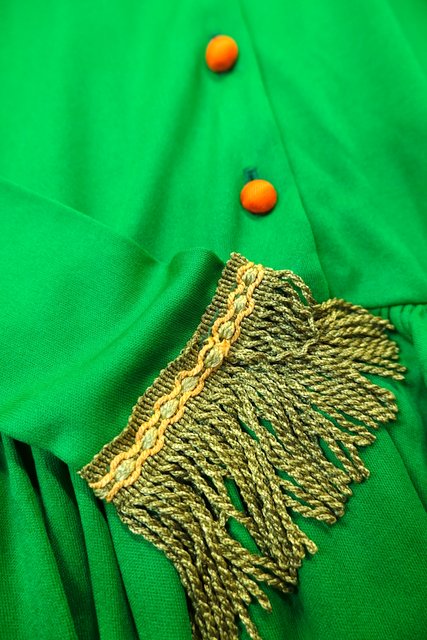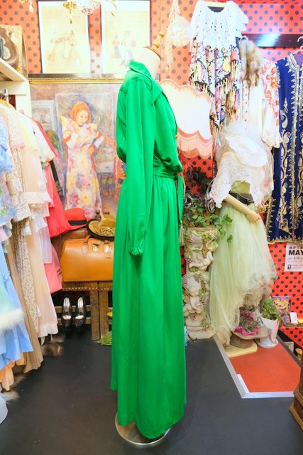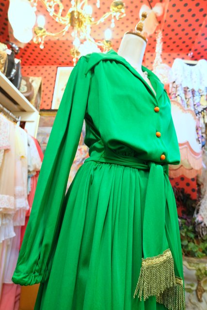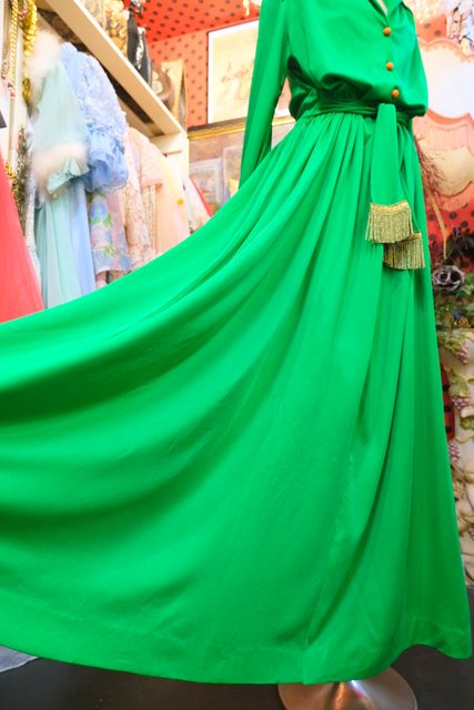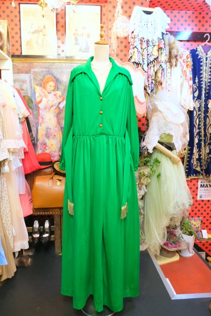 色鮮やかなグリーンベースにオレンジボタンやフリンジ付き腰ひもデザインがお洒落な1970年代頃のヴィンテージロングワンピース