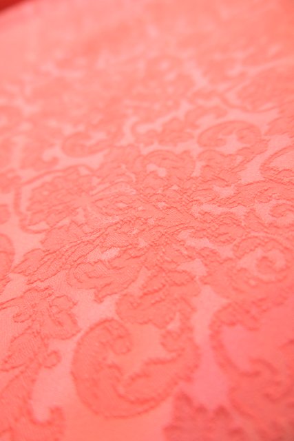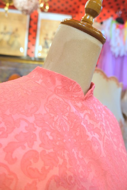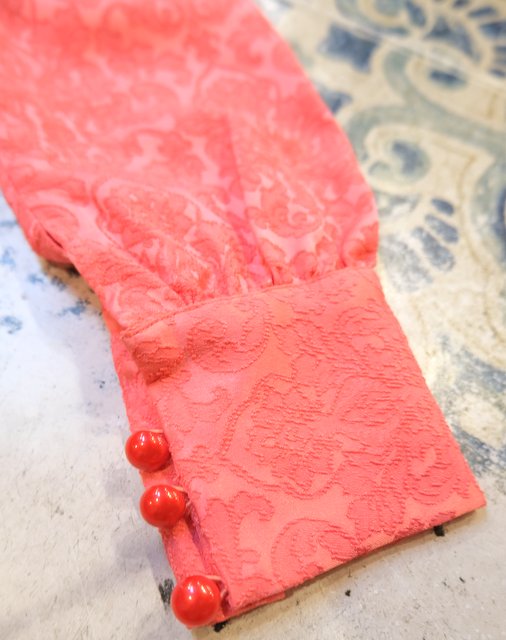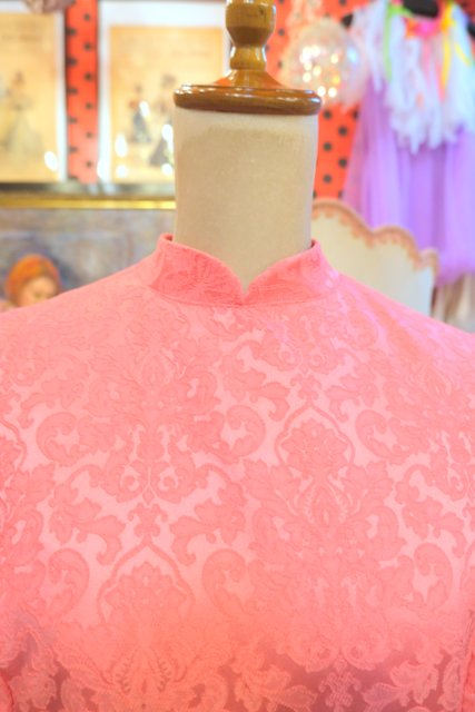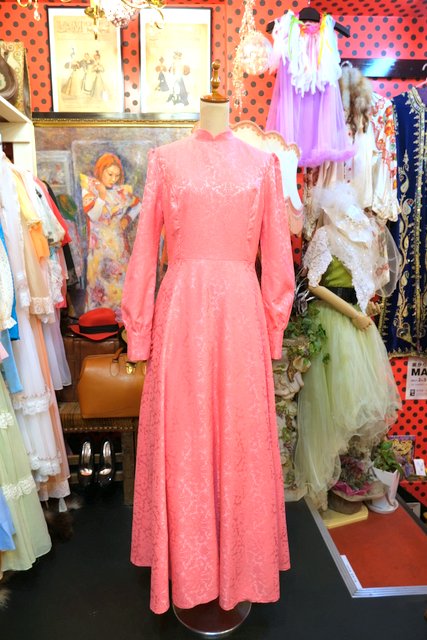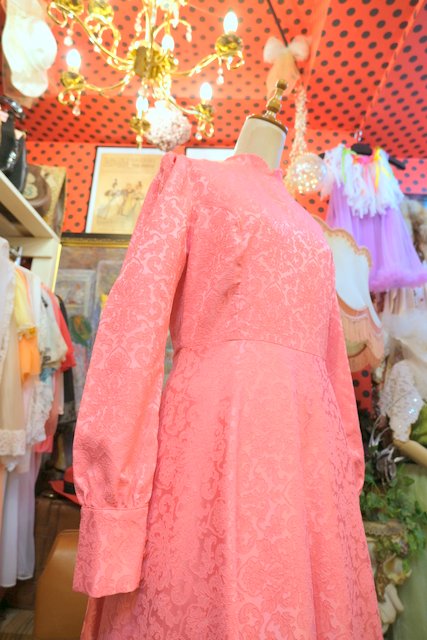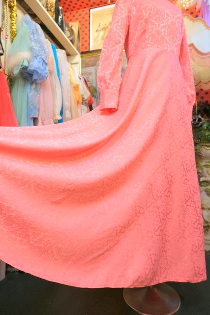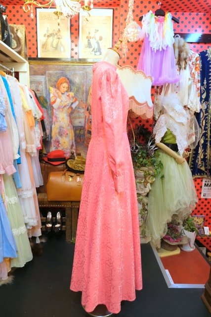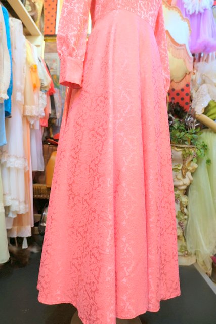 エレガントゴージャスな総柄が浮き出たような生地にパフスリーブ×ロングカフスが魅力的な1970年代頃のヨーロピアンパーティーロングドレス