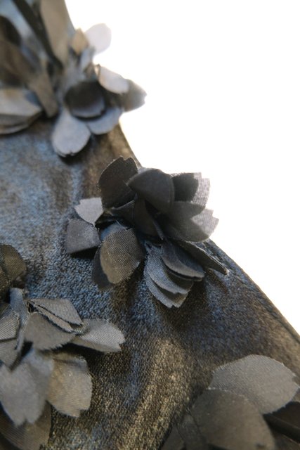 透け感があるエレガントなシフォンフロッキー加工にお花コサージュ付きのバリモアカラーやボリューム袖×フレアカフスが魅力的なフランス製ヴィンテージブラウス