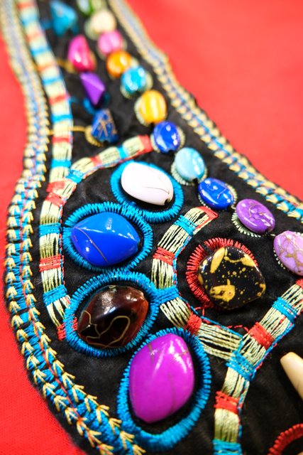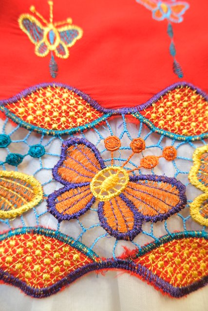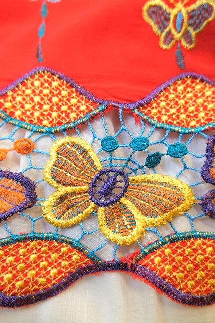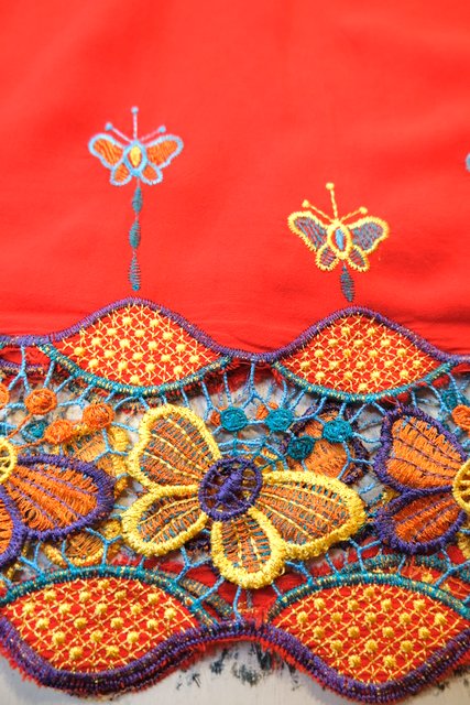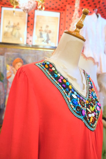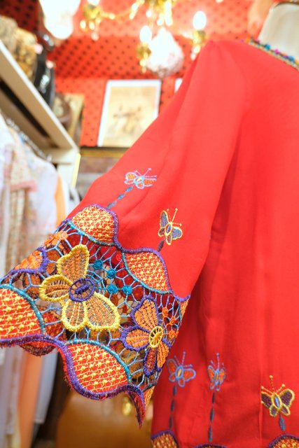 個性的な赤ベースに胸元のカラフル装飾や袖先、裾のポップな蝶刺繍レースデザインが可愛いヨーロピアンチュニックカットソー ★SALE★