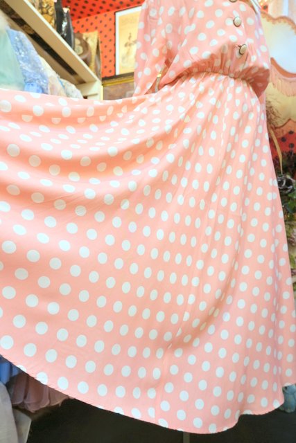 ピンク×白水玉デザインに2枚重ねの襟やフレアスカートが可愛らしい1980年代頃のヨーロピアンヴィンテージワンピース