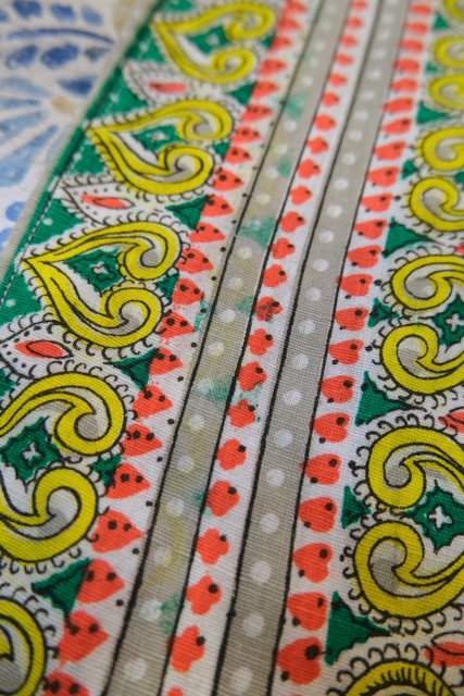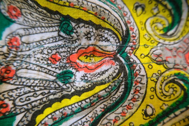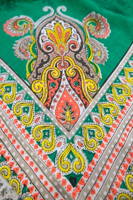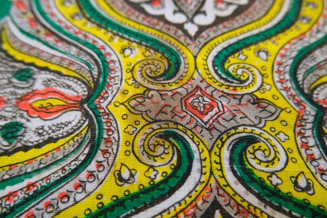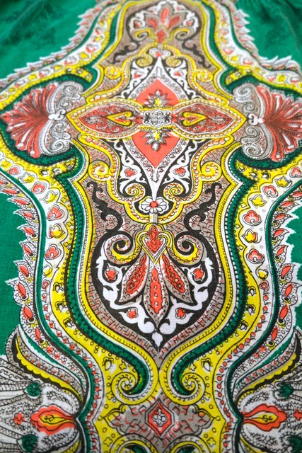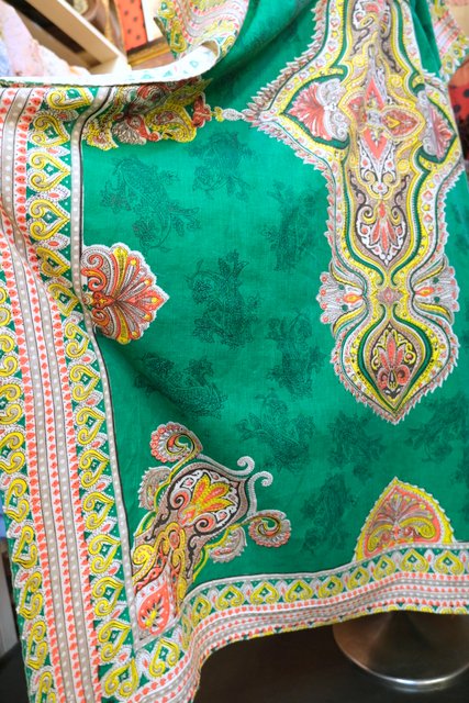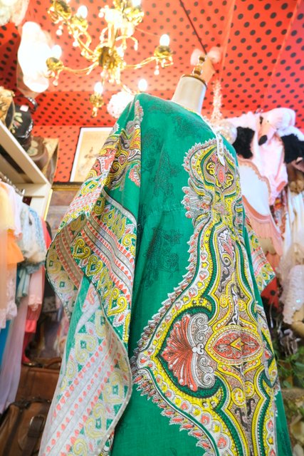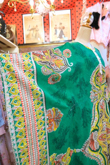エレガントなペイズリー柄やカラフルサイケデリック模様に両サイドのドレープ感が魅力的な1970年代頃のヨーロピアンヴィンテージエスニックワンピース