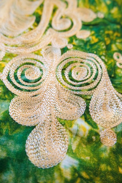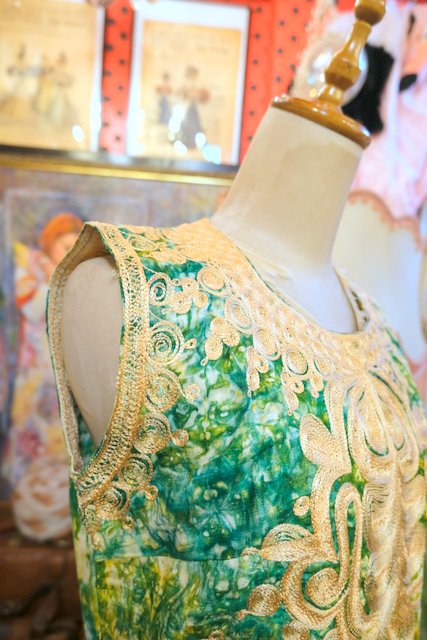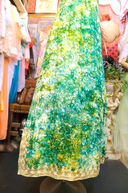 グリーン×ベージュイエロー系のムラ染めに首周りや胸元のゴージャスな刺繍が魅力的なヨーロピアンヴィンテージエスニックワンピース ★SALE★