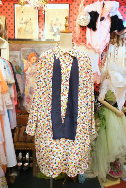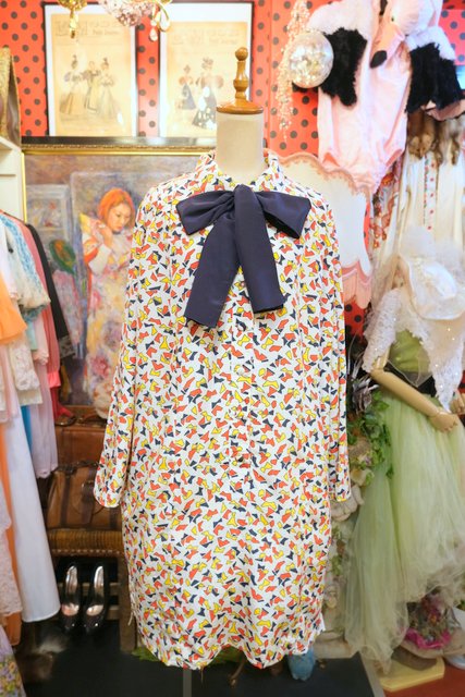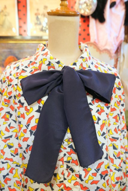 レトロな総柄プリントにネイビーのリボンボウタイデザインがお洒落な1980年代頃のヨーロピアンシャツワンピース