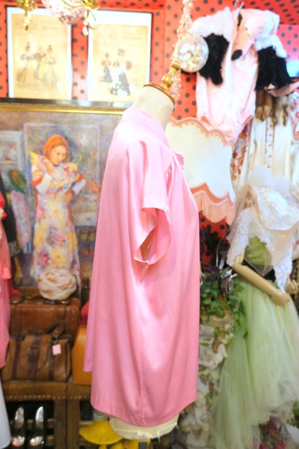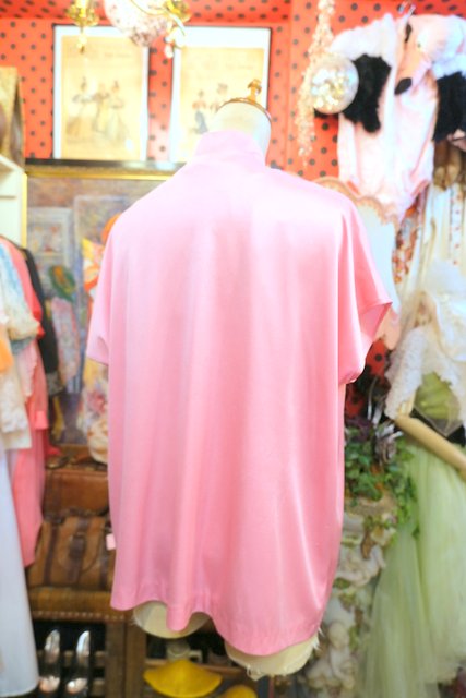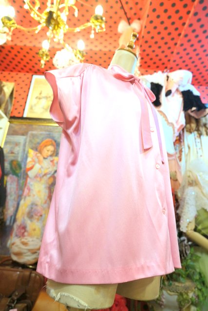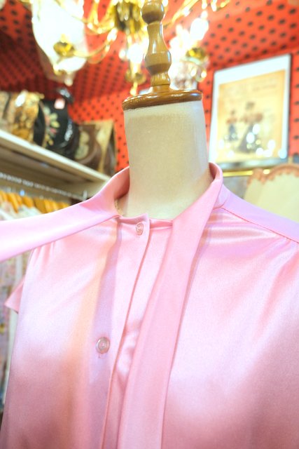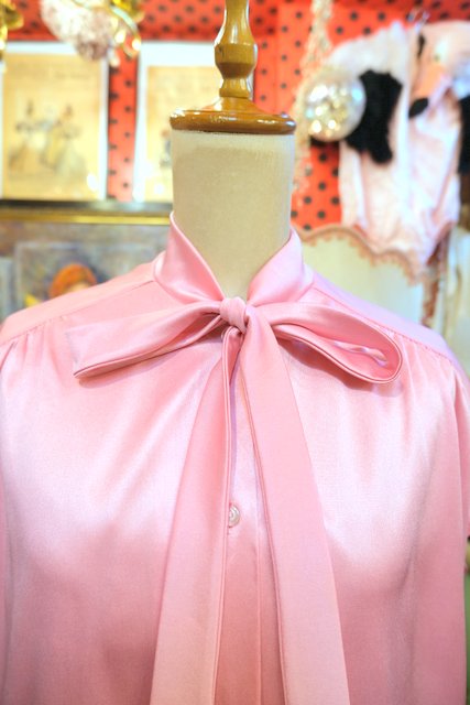 光沢感があるピンクにリボンボウタイやフレンチスリーブが魅力的なヨーロピアンエレガントブラウス