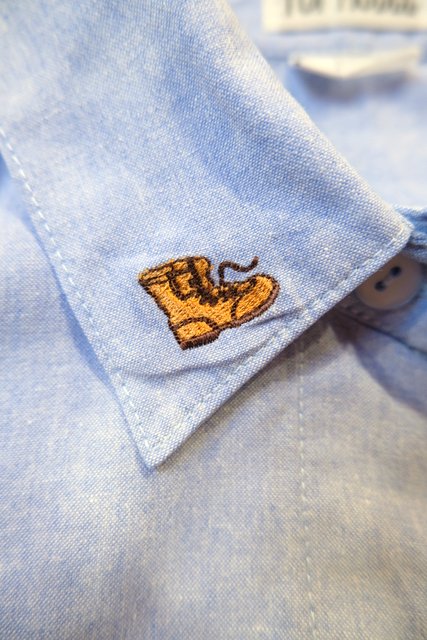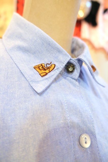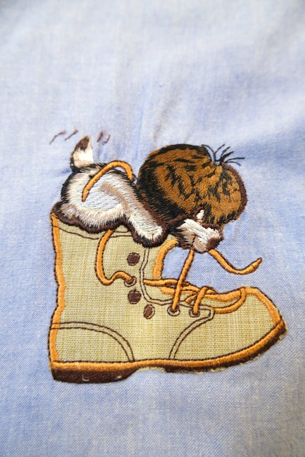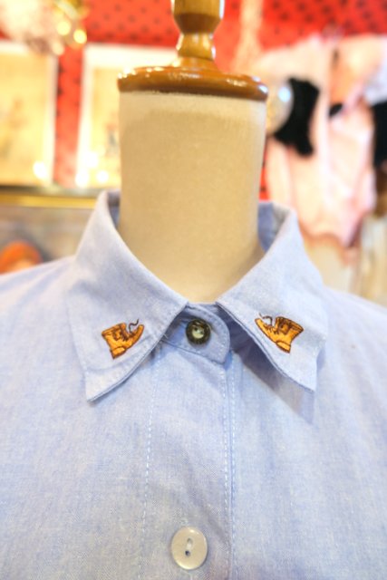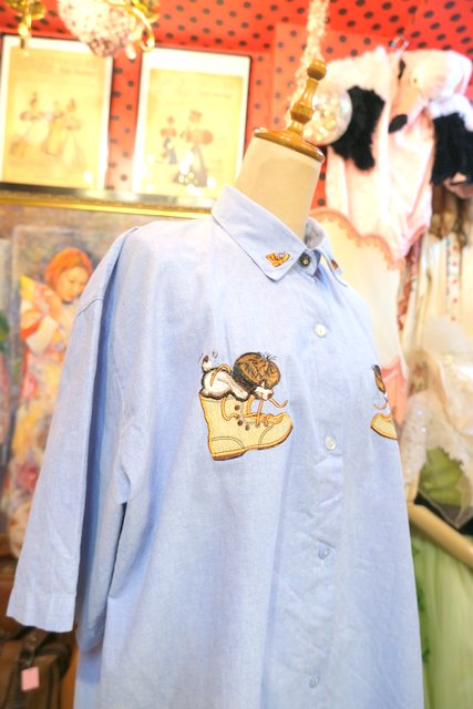 ブーツで遊ぶ子犬刺繍や襟のブーツ刺繍が可愛らしい1980年代頃のヨーロピアンオーバーサイズシャツ ★SALE★