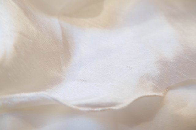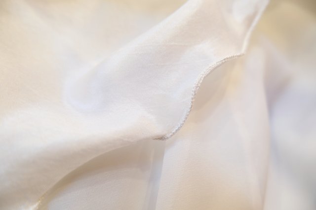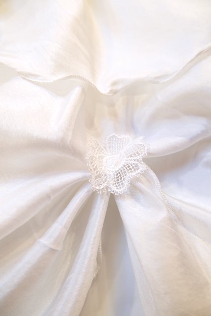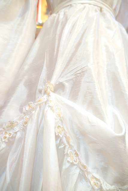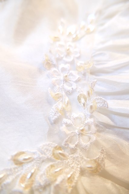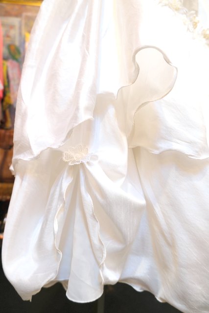 光沢感がある白ベースにフリル×ビジュー付き花柄刺繍テープやボリュームパフから袖先にむかって細くなるエレファントスリーブ、ドレープ感があるギャザー入りのスカートが素敵な1970年代頃のヨーロピアンヴィンテージドレス
