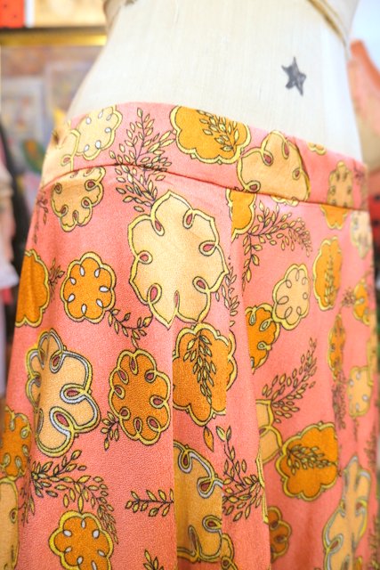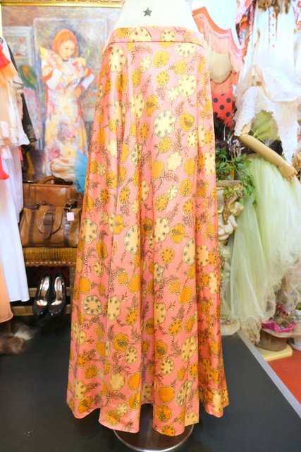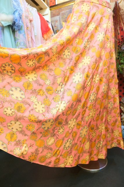 ピンクベースにレトロポップな総柄プリント×エレガントな広がりが魅力的な1970年代頃のヨーロピアンロングスカート