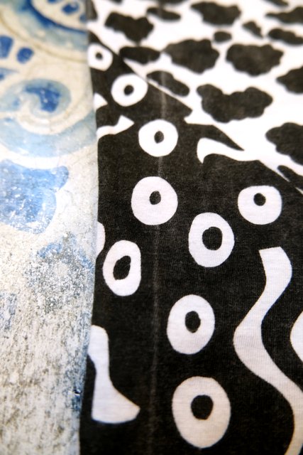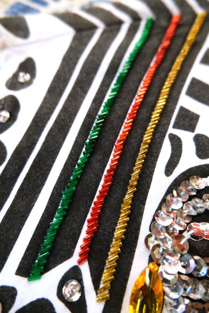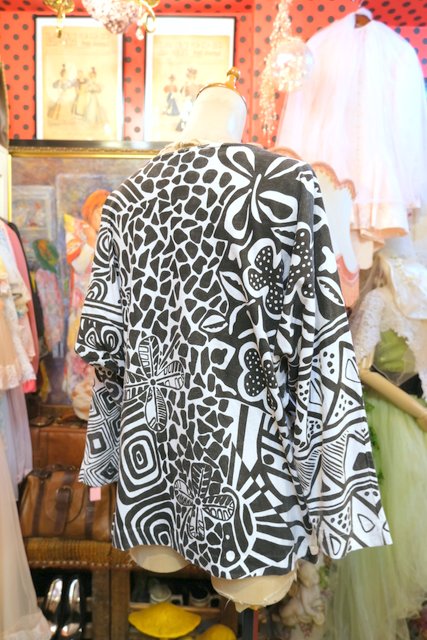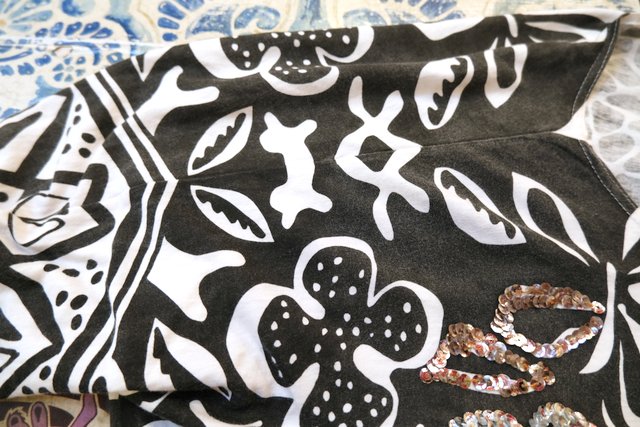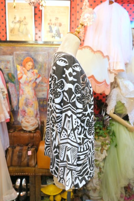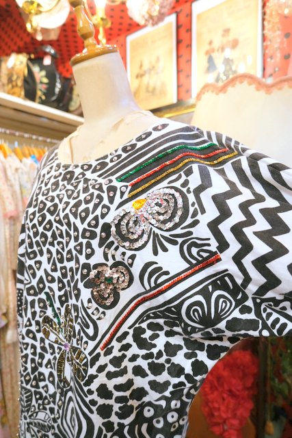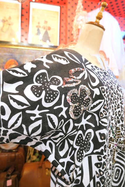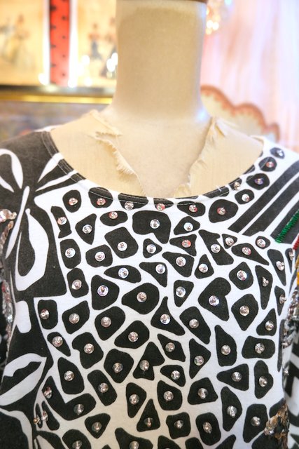 白黒のモノトーン幾何学模様にビーズスパンコールの装飾デザインがお洒落な1980年代頃のヨーロピアンドルマンスリーブカットソー