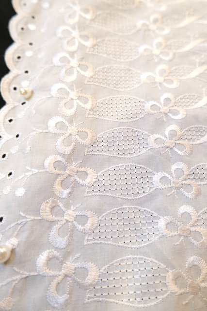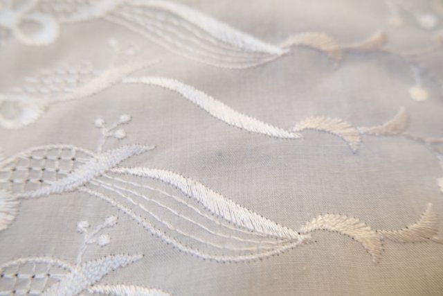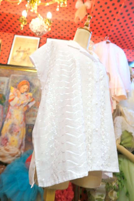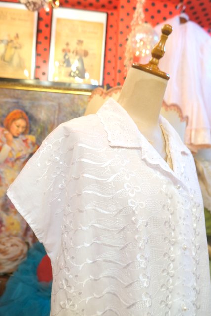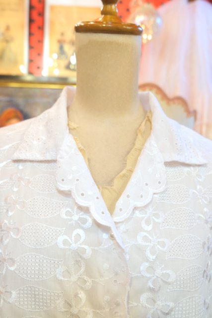 華やかな花柄刺繍にカットワークレース×スカラップ襟がお洒落で可愛い1970年代頃のヨーロピアンフレンチスリーブブラウス ★SALE★