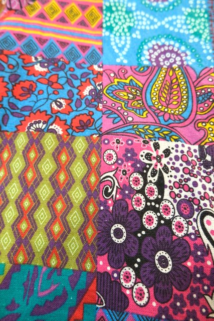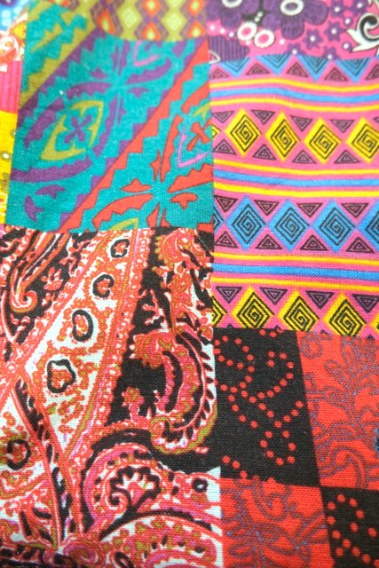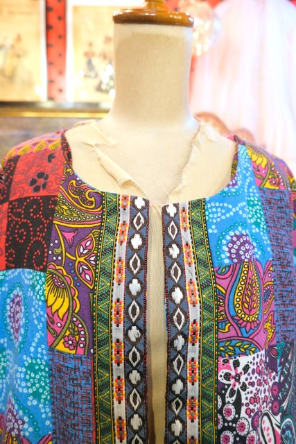 カラフルなサイケデリックエスニック模様のパッチワークプリントにレトロなテープデザインが魅力的な1980年代頃のヨーロピアンオーバーサイズジャケット ★SALE★