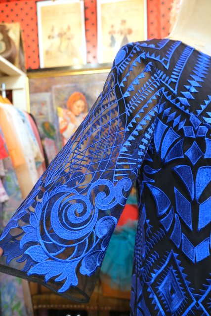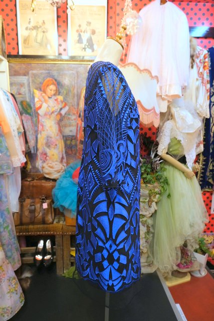パーティーやイベント衣装におススメ!透け感がある黒シフォンにブルーの豪華な刺繍デザインが目を惹くヨーロピアンパーティードレス