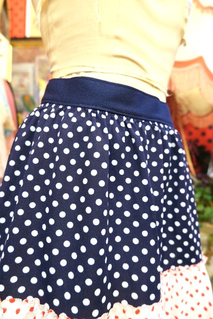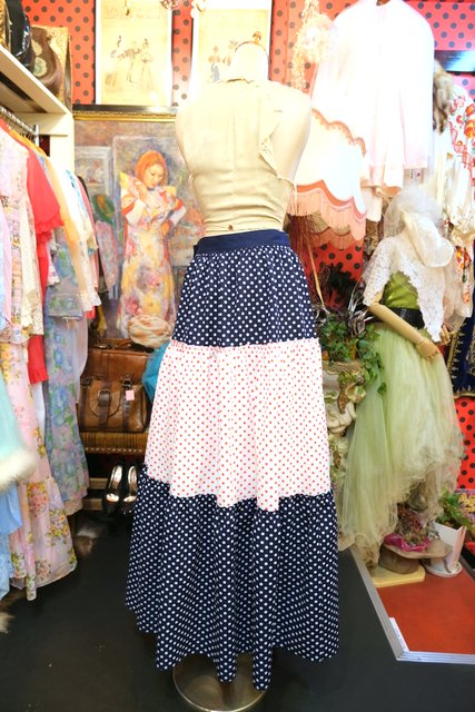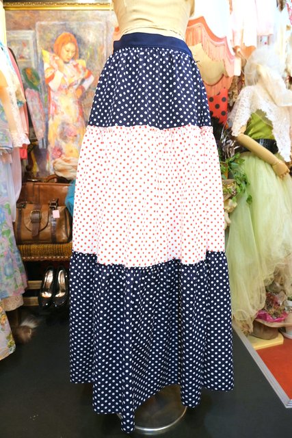 レトロポップなネイビー×白、白×赤ドット柄のティアードデザインが可愛らしい1970年代頃のヨーロピアンロングスカート