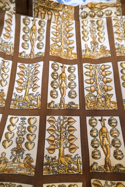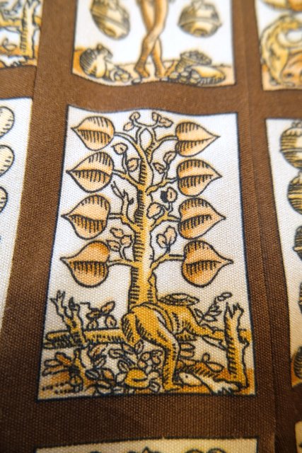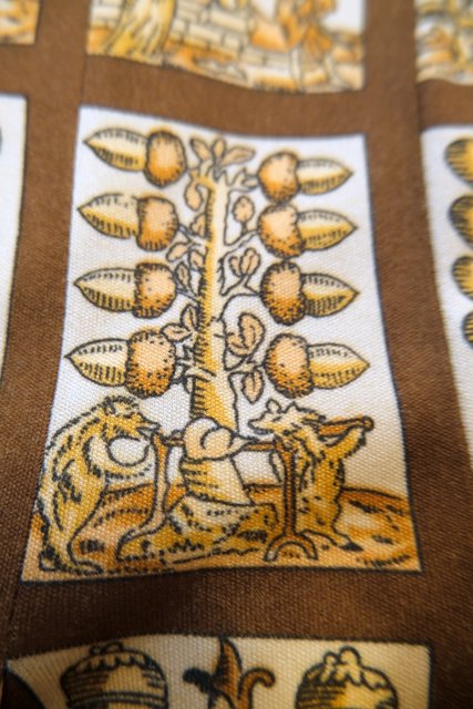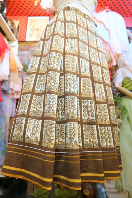 ベージュ×こげ茶色のチェック柄にレトロでユニークなプリントが魅力的な1960~70年代頃のヨーロピアンヴィンテージスカート