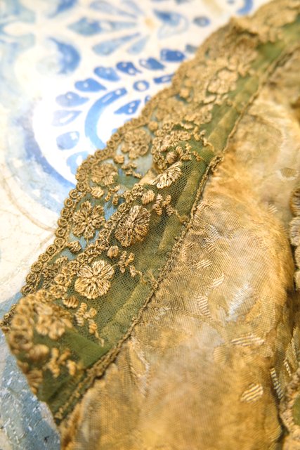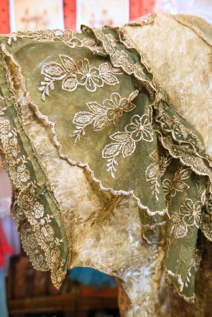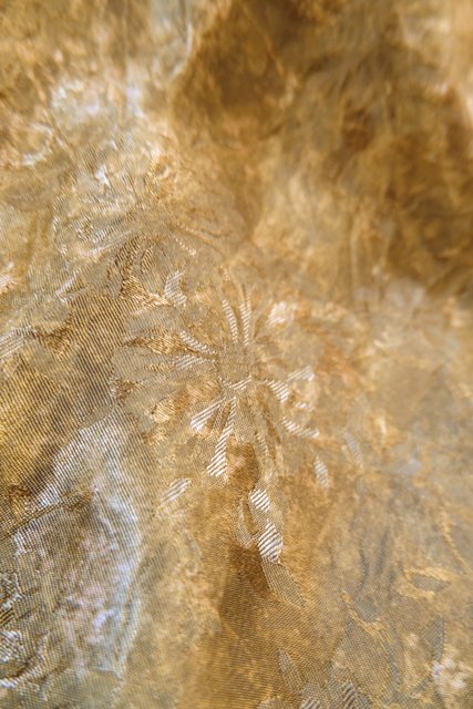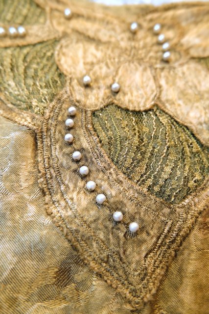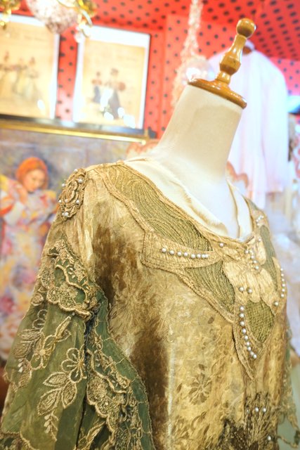 光沢がある花柄生地にパール付きのお花パッチワークやエレガントなレースデザインが魅力的な1980年代頃のヨーロピアンヴィンテージカットソー