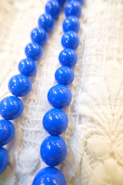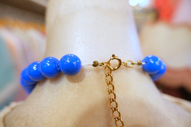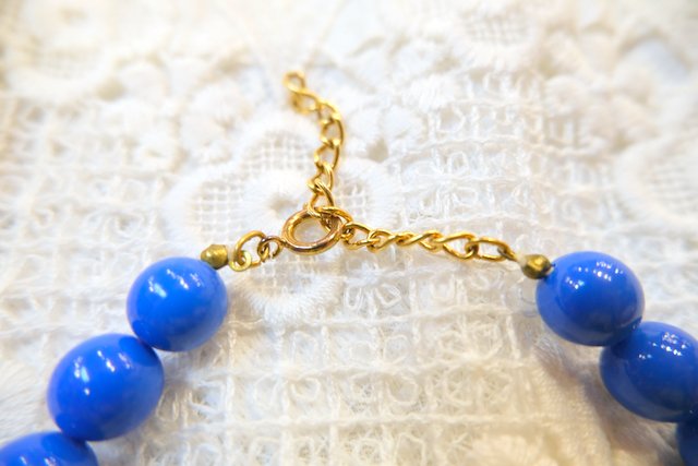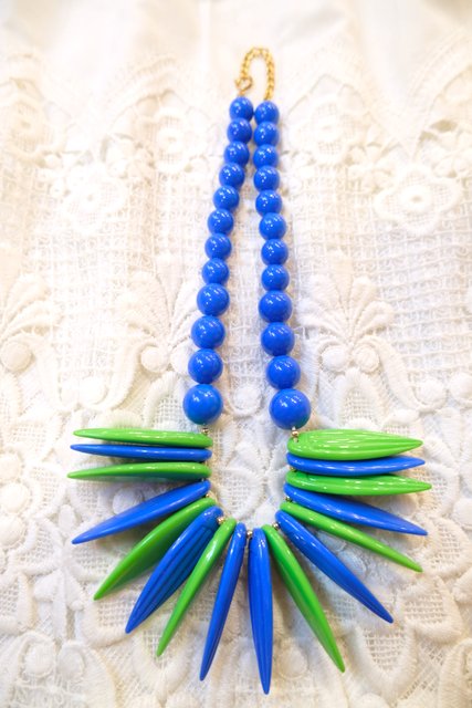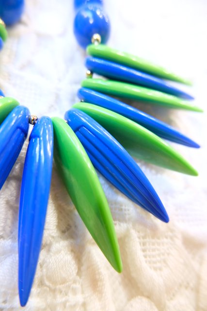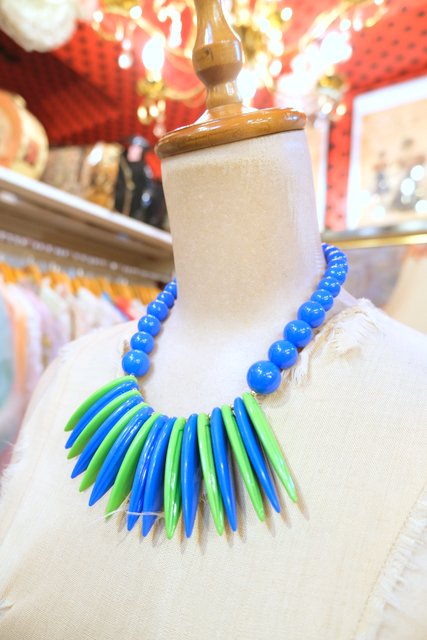ブルー×黄緑色のカラフルポップな色合いが目を惹くベルギーで見つけた1970年代頃のヨーロピアンヴィンテージネックレス シンプルクローズのアクセントにおススメ!